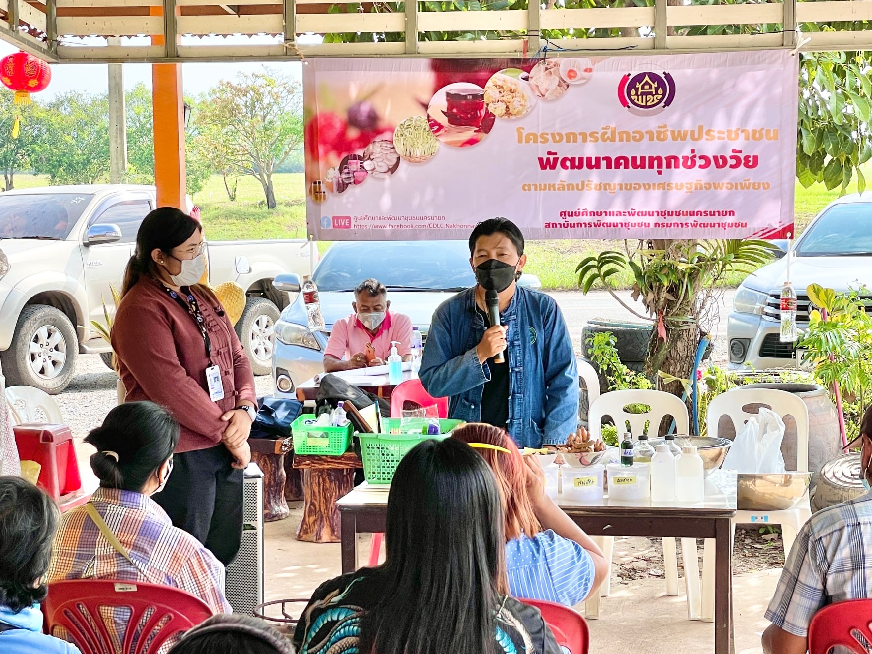 วันอังคาร ที่ 22 กุมภาพันธ์ พ.ศ. 2565 เวลา 09.00 น. – 12.00 น. ศูนย์ศึกษาและพัฒนาชุมชนนครนายก ร่วมกับสำนักงานพัฒนาชุมชนจังหวัดปราจีนบุรี และสำนักงานพัฒนาชุมชนอำเภอบ้านสร้าง และอำเภอศรีมโหสถ จัดโครงการฝึกอาชีพประชาชนพัฒนาคนทุกช่วงวัยตามหลักปรัชญาของเศรษฐกิจพอเพียง รุ่นที่ 5 ในหัวข้อ “น้ำมันเหลืองไพล” ผู้เข้ารับการฝึกอบรม ประกอบด้วย บุคคลที่มีรายได้น้อย บุคคล/ครัวเรือนเป้าหมาย จาก TPMAP Logbook กลุ่มตกหล่นจากระบบ และกลุ่มครัวเรือนเปราะบางของจังหวัด และผู้ที่สนใจ รวมทั้งสิ้น 15 คน ณ ศูนย์เรียนรู้ครัวเรือนต้นฯ นางสอาด สังข์กร ตำบลบ้านสร้าง อำเภอบ้านสร้าง จังหวัดปราจีนบุรี