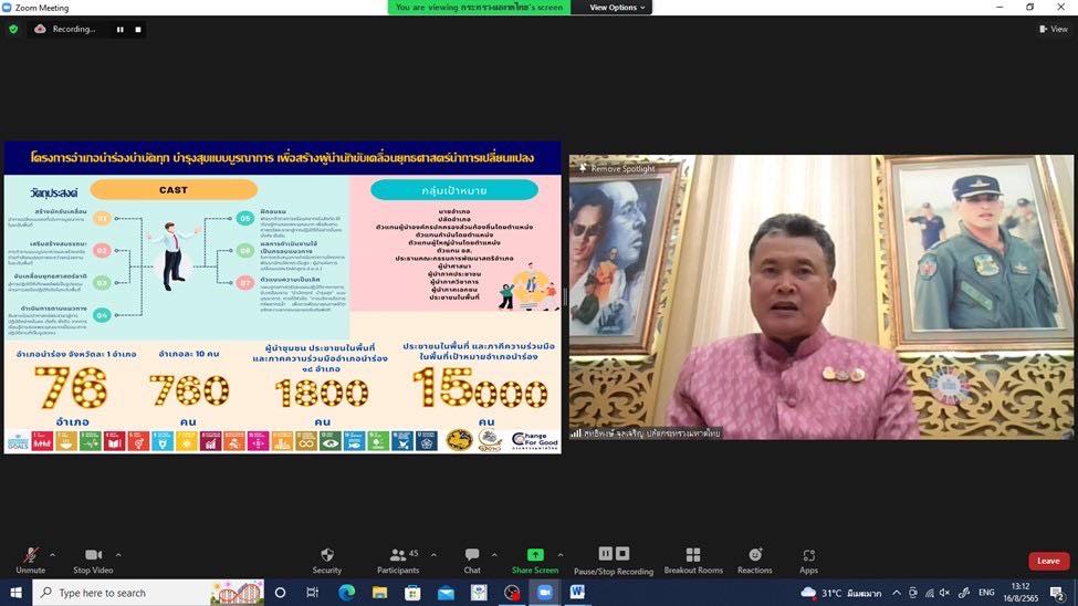 โอกาสนี้ นายสุทธิพงษ์ จุลเจริญ ปลัดกระทรวงมหาดไทย บรรยายพิเศษในหัวข้อ “ทำไมต้อง “CAST” Change Agents For Strategic Transformation (CAST)” ผ่านระบบ Zoom Could Meeting โดยมี นายบุญธรรม ถาวรทัศนกิจ ผู้อำนวยการสถาบันดำรงราชานุภาพ กล่าวรายงาน และนางสาวเยาวมาลย์ เศรษฐา ผู้อำนวยการศูนย์ศึกษาและพัฒนาชุมชนนครนายก พร้อมผู้เข้ารับการอบรมร่วมรับฟังฯ