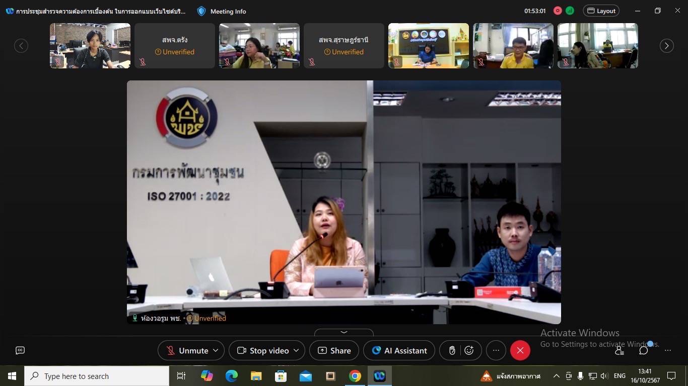 วันที่16 ต.ค. 2567 เวลา 13.30 นายชัยทวัตน์ ดำศรีสวัสดิ์ ผู้อำนวยการศูนย์ศึกษาและพัฒนาชุมชนนครนายก มอบหมายนางสาวชนิชกานต์ ริมสมุทร์ เจ้าพนักงานโสตทัศนศึกษาชำนาญงาน เข้าร่วมการประชุมสำรวจความต้องการเบื้องต้นในการออกแบบเว็บไซต์บริการดิจิทัลของกรมการพัฒนาชุมชน (Digital Service) ที่เป็นไปตามมาตรฐานเว็บไซต์ภาครัฐ ผ่านระบบประชุมทางไกล (Webex) ถ่ายทอดจากห้อง War Room ชั้น 5 กรมการพัฒนาชุมชน จัดประชุมโดย ศูนย์สารสนเทศเพื่อการพัฒนาชุมชน กรมการพัฒนาชุมชน