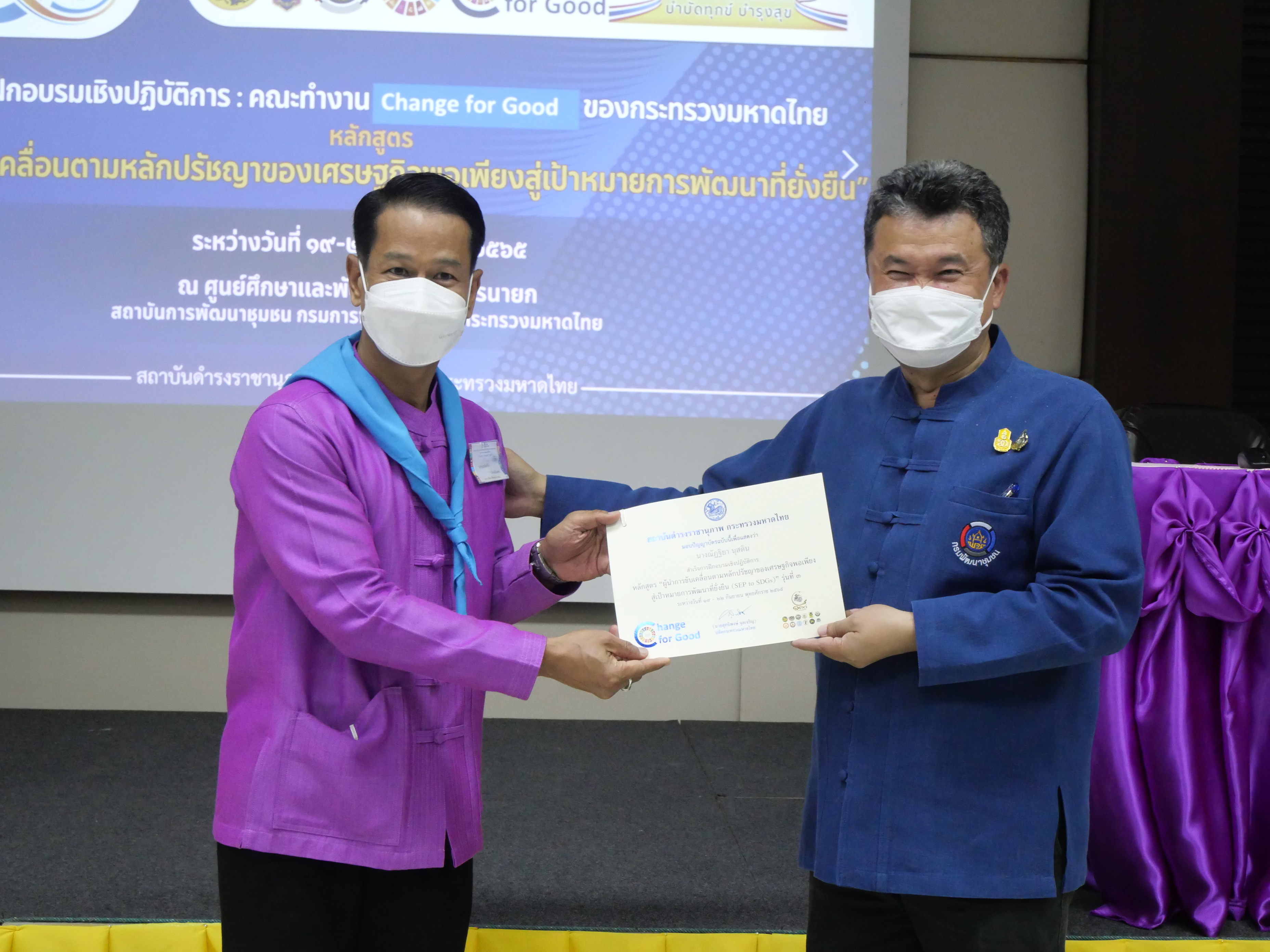 วันที่ 22 กันยายน 2565 ศูนย์ศึกษาและพัฒนาชุมชนนครนายก ร่วมกับศูนย์ศึกษาและพัฒนาชุมชนอุดรธานี และสถาบันดำรงราชานุภาพ ดำเนินการฝึกอบรมโครงการฝึกอบรมเชิงปฏิบัติการ : คณะทำงาน Change for Good ของกระทรวงมหาดไทย หลักสูตร “ผู้นำการขับเคลื่อนตามหลักปรัชญาของเศรษฐกิจพอเพียงสู่เป้าหมายการพัฒนาที่ยั่งยืน” รุ่นที่ 3 ระหว่างวันที่ 19-22 ก.ย. 2565