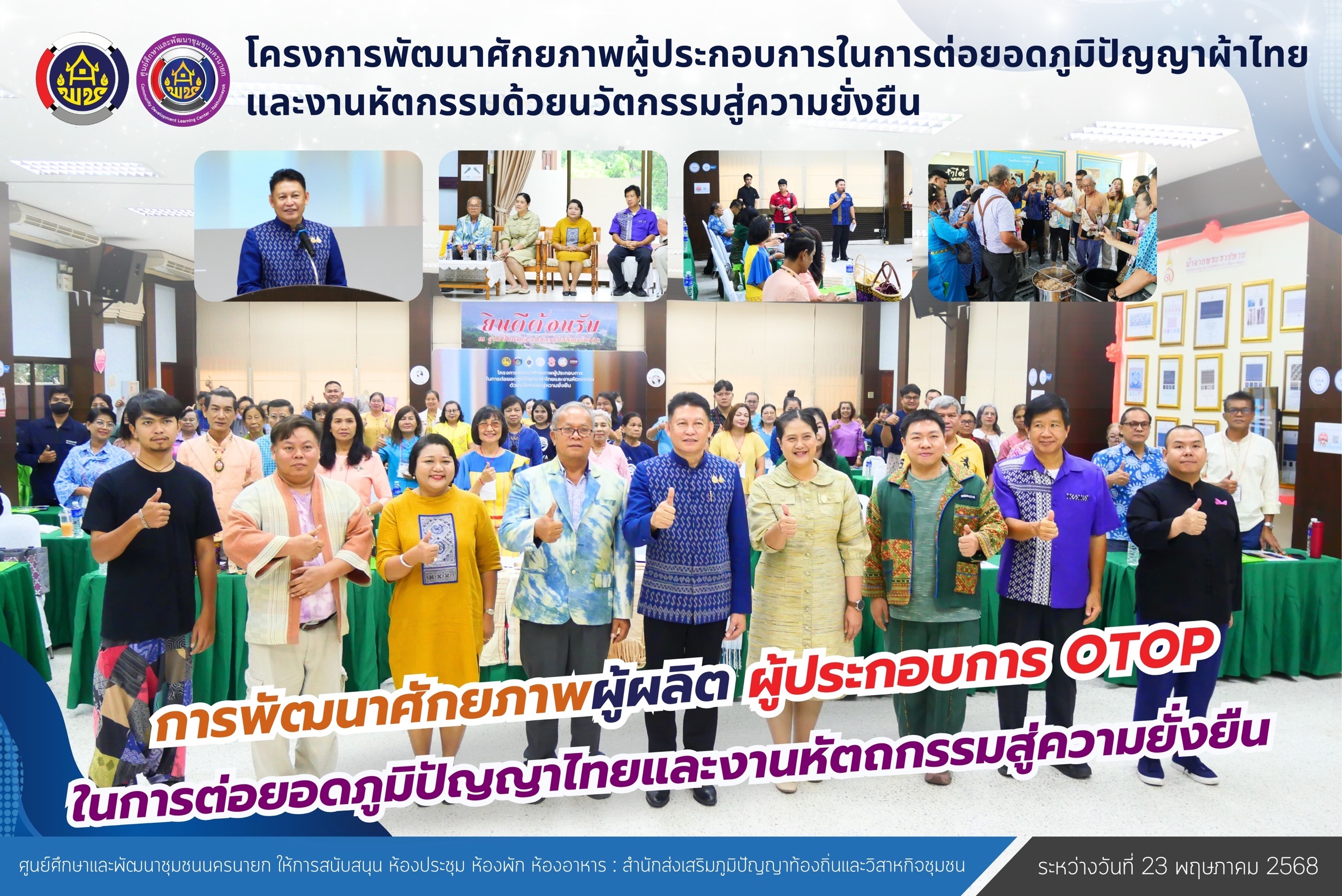วันที่ 23 พ.ค. 2568 เวลา 09.00 น. ศูนย์ศึกษาและพัฒชุมชนนครนายก ให้การสนับสนุนอาคารสถานที่ในการดำเนินโครงการพัฒนาศักยภาพผู้ประกอบการในการต่อยอดภูมิปัญญาผ้าไทยและงานหัตกรรมด้วยนวัตกรรมสู่ความยั่งยืน โดยสำนักส่งเสริมภูมิปัญญาท้องถิ่นและวิสาหกิจชุมชน