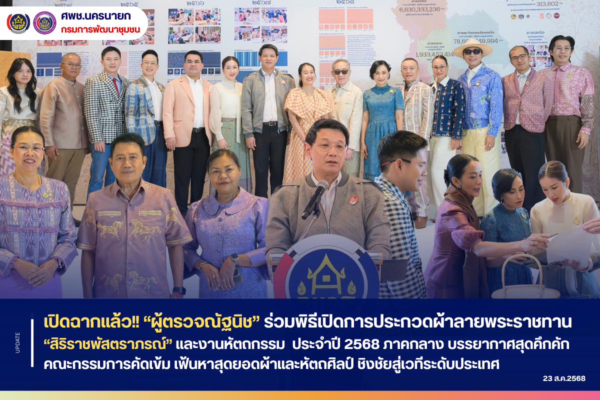 นายสยาม ศิริมงคล อธิบดีกรมการพัฒนาชุมชน เป็นประธานในพิธีเปิดและร่วมเป็นกรรมการประกวดผ้าลายพระราชทาน “ผ้าลายสิริราชพัสตราภรณ์” และงานหัตถกรรม ประจำปี 2568 ภาคกลาง โดยได้รับเกียรติจากนางจิณณารัชช์ สัมพันธรัตน์ นายกสมาคมแม่บ้านมหาดไทย พร้อมด้วยนายเกียรติศักดิ์ ตรงศิริ ผู้ว่าราชการจังหวัดนนทบุรี นางพรศรี ตรงศิริ ประธานแม่บ้านมหาดไทยจังหวัดนนทบุรี นางอรจิรา ศิริมงคล ประธานชมรมแม่บ้านพัฒนาชุมชน และคณะผู้บริหารกรมการพัฒนาชุมชน ร่วมพิธีเปิดฯ ในการนี้ นางสาวณัฐนิช อินทสระ ผู้ตรวจราชการกรม ร่วมเป็นเกียรติในพิธีเปิดด้วย