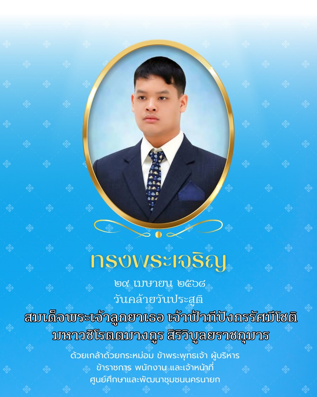 ศูนย์ศึกษาและพัฒนาชุมชนนครนายก ขอเชิญชวนประชาชนร่วมลงนามถวายพระพร สมเด็จพระเจ้าลูกยาเธอ เจ้าฟ้าทีปังกรรัศมีโชติ มหาวชิโรตตมางกูร สิริวิบูลยราชกุมาร เนื่องในโอกาสวันคล้ายวันประสูติ วันที่ 29 เมษายน 2568 ผ่านระบบออนไลน์ ที่เว็บไซต์หน่วยราชการในพระองค์ wellwishes.royaloffice.th ระหว่างวันที่ 28 – 30 เมษายน 2568