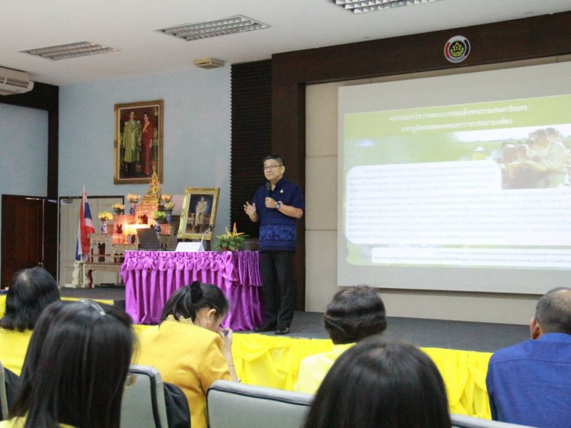นายอาจณรงค์ สัตยพานิช ผู้ตรวจราชการกรมการพัฒนาชุมชน บรรยายให้ความรู้ หัวข้อ นโยบายและทิศทางการขับเคลื่อนภารกิจกรมการพัฒนาชุมชน(เหลียวหลัง)