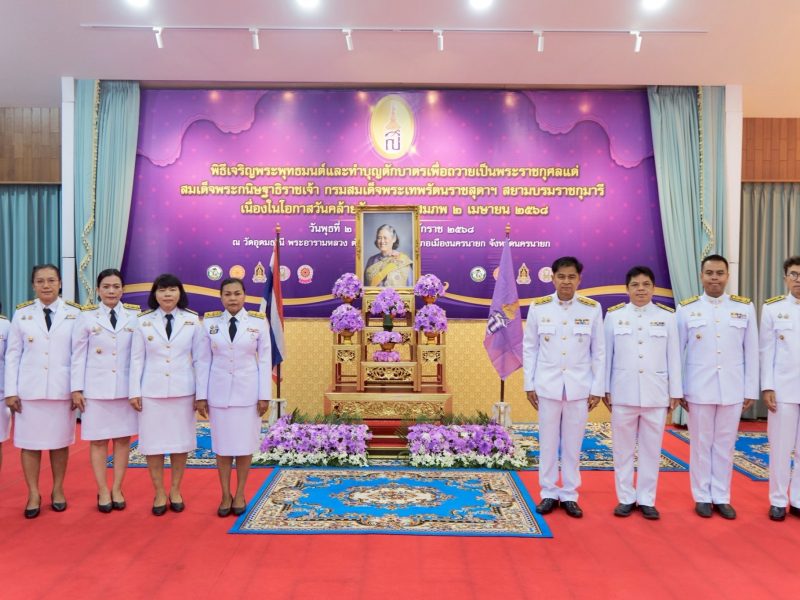 ผู้ตรวจราชการกรม (น.ส.ณัฐนิช อินทสระ) นำบุคลากร ศพช.นครนายก เข้าร่วมพิธีเจริญพระพุทธมนต์และทำบุญตักบาตรเพื่อถวายเป็นพระราชกุศลแด่ สมเด็จพระกนิษฐาธิราชเจ้า กรมสมเด็จพระเทพรัตนราชสุดาฯ สยามบรมราชกุมารี เนื่องในโอกาสวันคล้ายวันพระราชสมภพ 2 เมษายน 2568 จังหวัดนครนายก