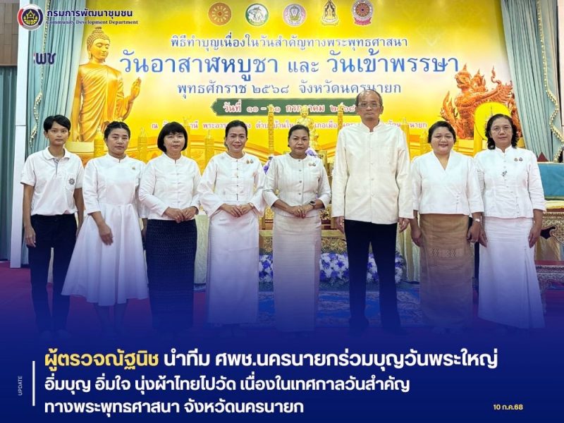 ผู้ตรวจณัฐนิช นำทีม ศพช.นครนายกร่วมบุญวันพระใหญ่ อิ่มบุญ อิ่มใจ นุ่งผ้าไทยไปวัด เนื่องในเทศกาลวันสำคัญทางพระพุทธศาสนา จังหวัดนครนายก